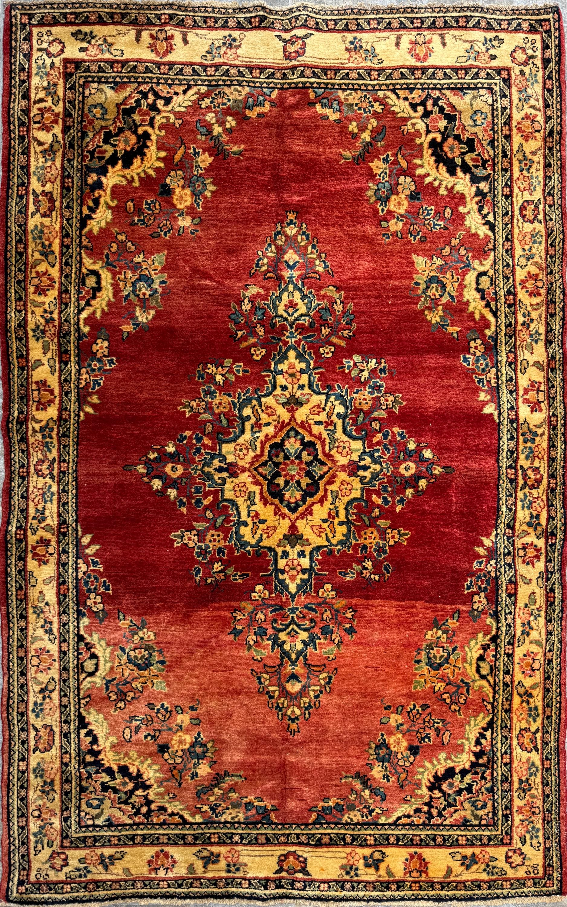 This 4.5 x 7 ft 100% wool rug showcases the timeless elegance of the Kashan weaving tradition. It features a deep red field with a large golden medallion at its center, framed by detailed floral sprays and a classic floral border in warm ivory and gold tones. The design is enhanced by subtle abrash (natural color variations), which add authenticity and depth to the piece.